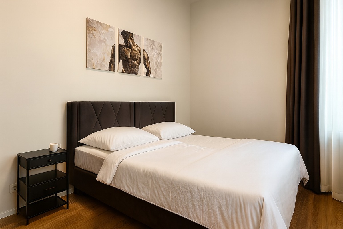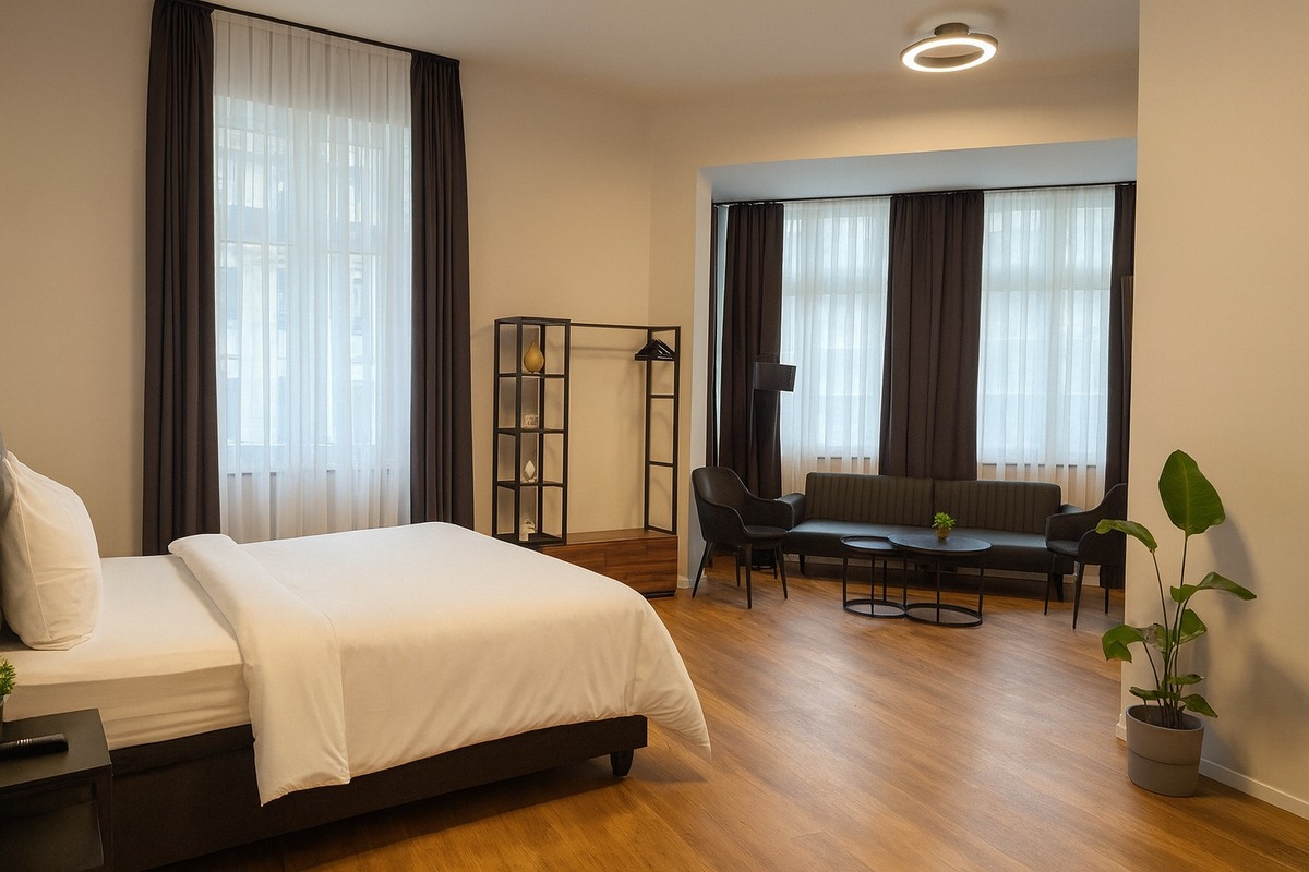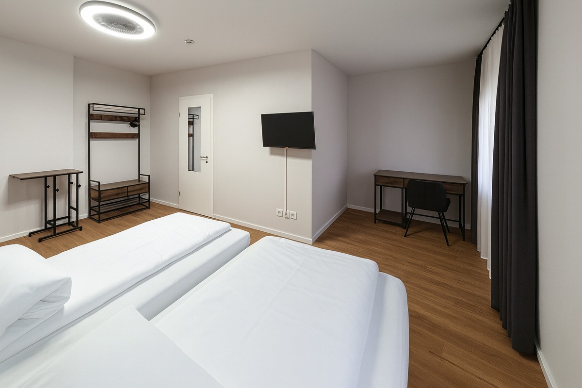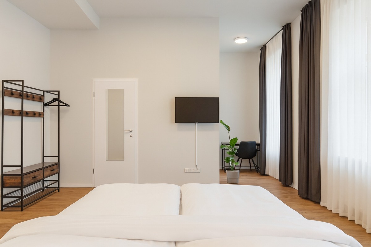 Genießen Sie erholsame Nächte in unserem modern eingerichteten Zimmer. Ausgestattet mit einem komfortablen Doppelbett, stilvollem Interieur und allen Annehmlichkeiten für einen angenehmen Aufenthalt. Perfekt für Paare oder Geschäftsreisende, die Wert auf Komfort und eine zentrale Lage legen.