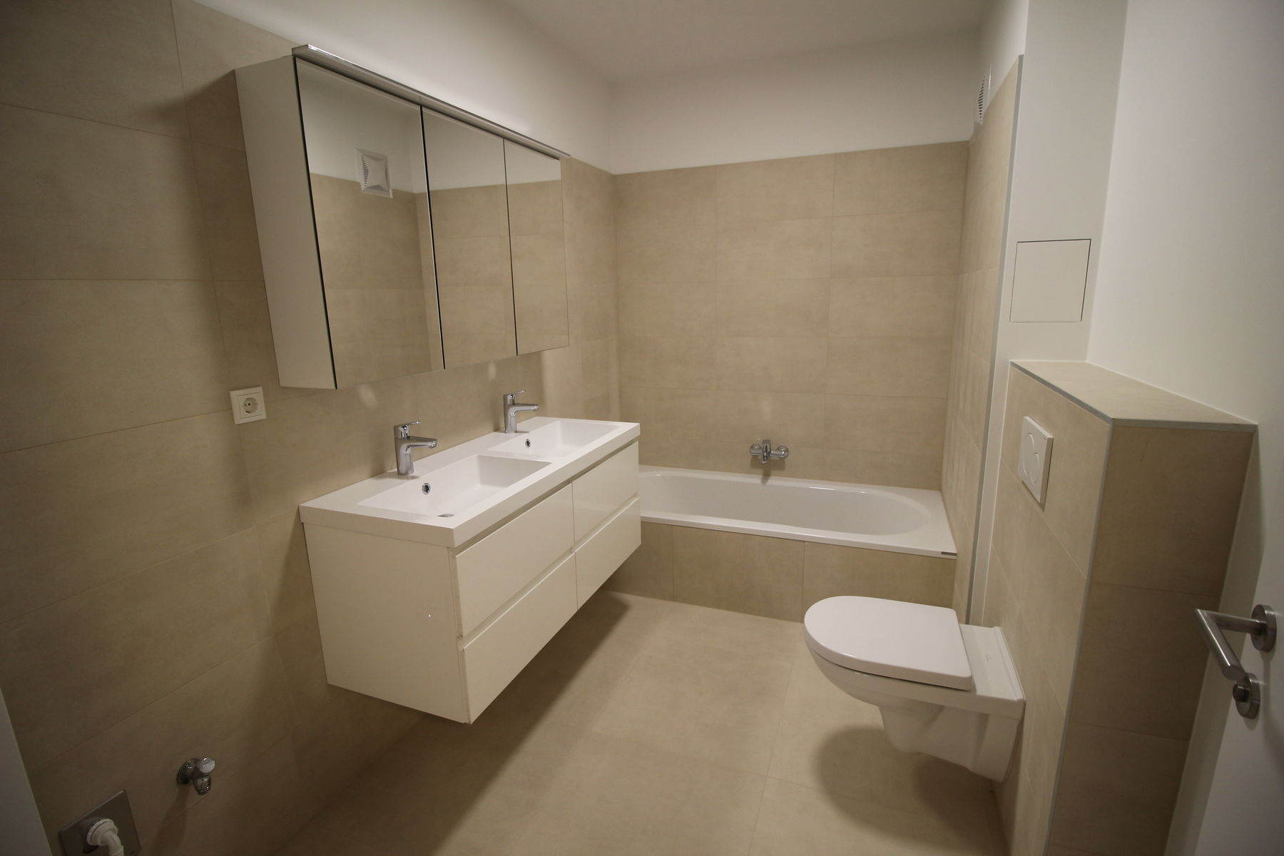 Das große Badezimmer ist mit einer Badewanne und einem Doppelwaschbecken ausgestattet. Die Wohnung verfügt über eine vom Badezimmer getrennte Toilette. Weiters gibt es einen geräumigen Abstellraum.